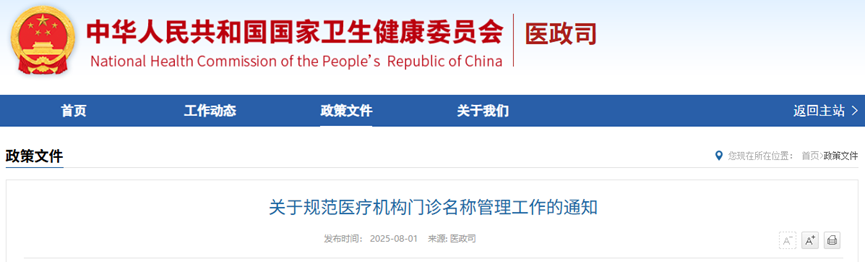 近日,国家卫生健康委员会、国家中医药管理局、国家疾病预防控制局联合发文,要求医疗机构门诊命名需依法合规、清晰准确,与诊疗科目匹配,禁用模糊、暗示疗效或标新立异名称。中医专病门诊以疾病、症状命名,特色及多学科门诊命名亦有规范。医疗机构需立行立改,相关部门将加强监管。(来源:国家卫生健康委)
